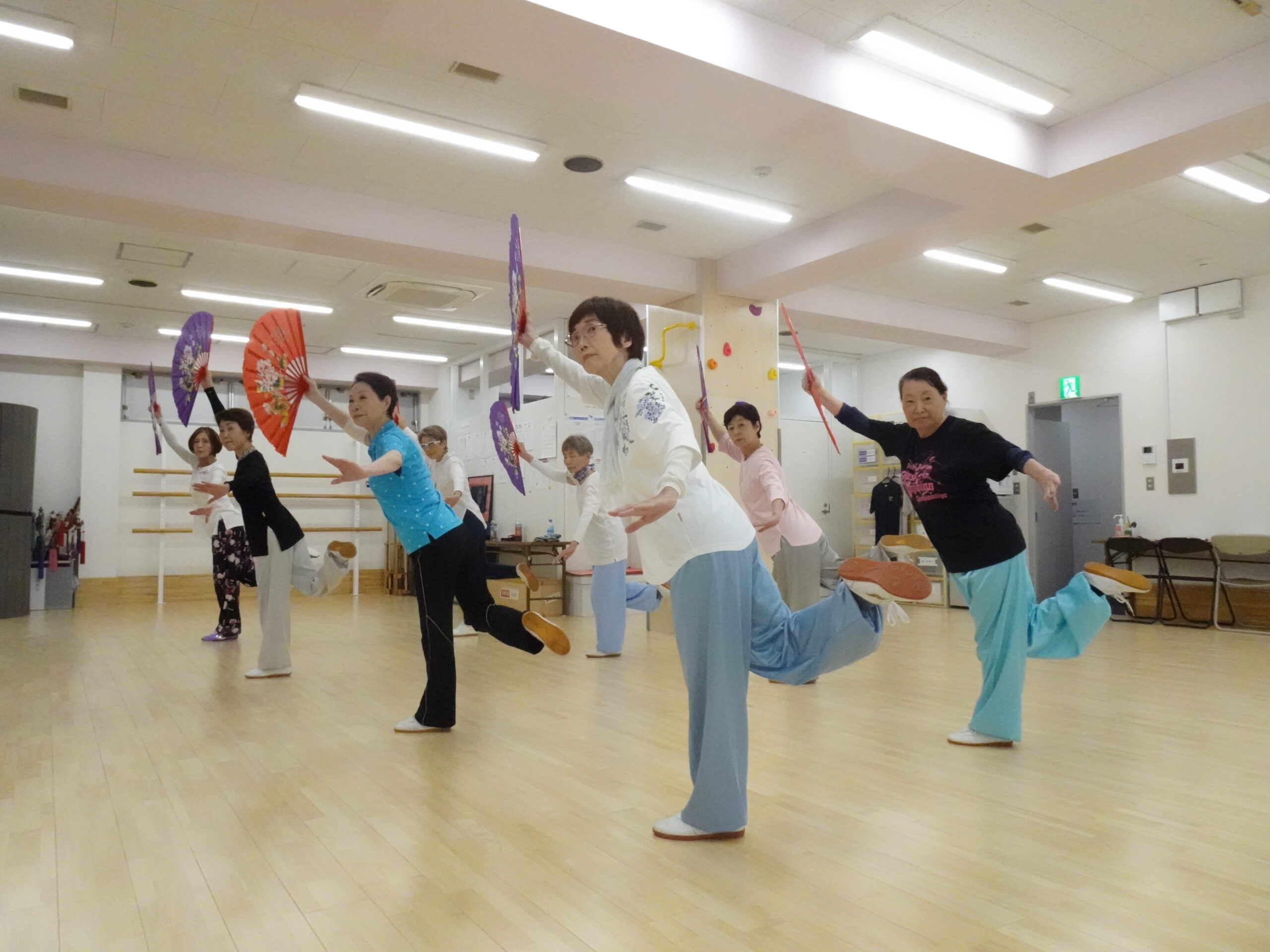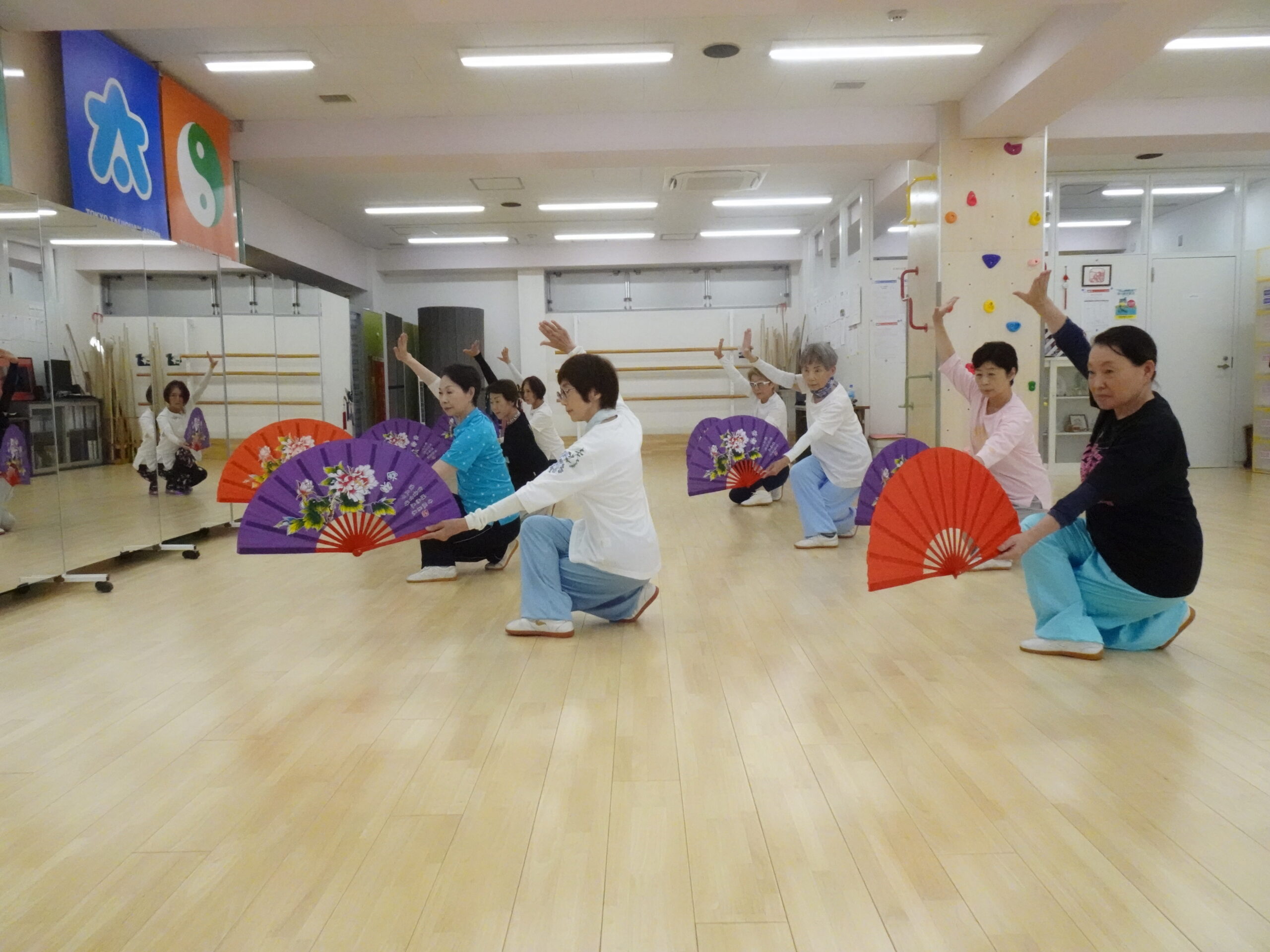 教室ではまずストレッチ、扇を持っての基本練習をしてから套路の練習に入っています。