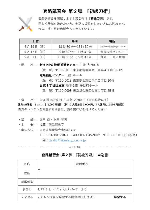 「初級刀術講習会」のご案内です。ご興味のある方は是非お申し込みをお願いいたします。 ※本講習会は、協会所属の会員を対象としています。他団体の方は受講いただけませんのでご注意ください。